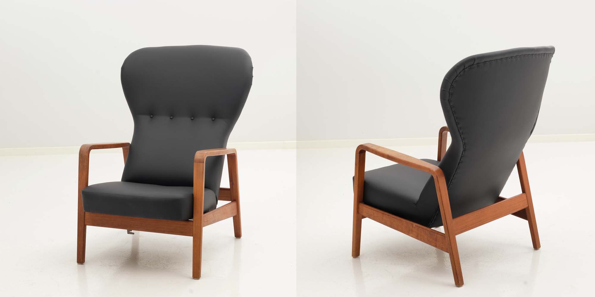 valmistama 1960-luvun Puck nojatuoli. Säädettävä puurunko. Uusi musta